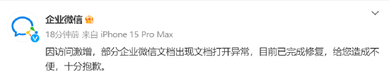 企业微信官方微博恢复称,因拜访激增,部分企业微信文档出现文档绽开额外,现在已完成诞生。