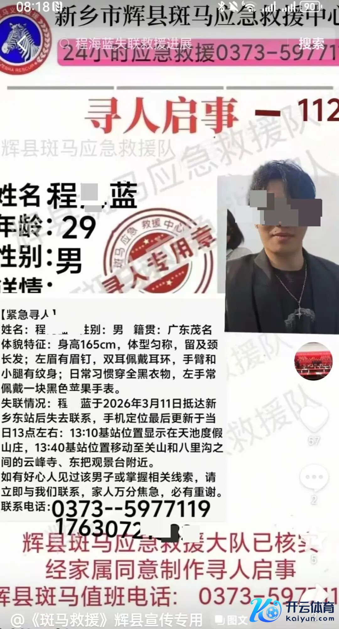 证据辉县斑马济急支持发布的寻东谈主缘起,程某蓝,29岁,男,籍贯广东茂名,身高165厘米,体型匀称,留及颈长发;左眉有眉钉,双耳率领耳饰,手臂和小腿有纹身。平素风气穿全黑衣物,左手常率领一块苹果腕表。